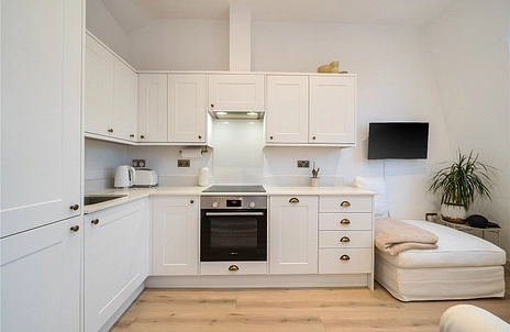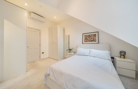 The open-plan kitchen and reception space is a true highlight, featuring high-grade integrated appliances and beautifully crafted cabinetry, all enhanced by dramatic extra-high ceilings that create an impressive sense of volume and light. French doors open directly onto a flat roof, which, subject to planning permission, offers excellent potential to use as a into a private roof terrace.