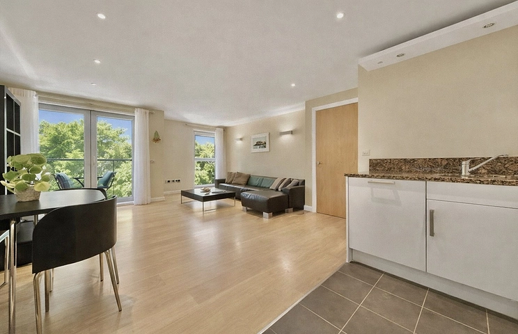 The kitchen/reception room forms the heart of the home, benefitting from generous proportions and large windows that welcome an abundance of natural light. The reception area enjoys calming views towards greenery and offers ample space for dining and entertaining. From here, doors open onto a private balcony, providing a peaceful spot for outdoor relaxation. The contemporary kitchen is fully fitted with high-quality integrated appliances and sleek cabinetry.