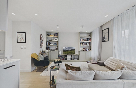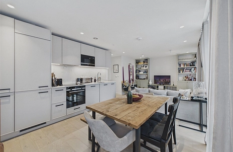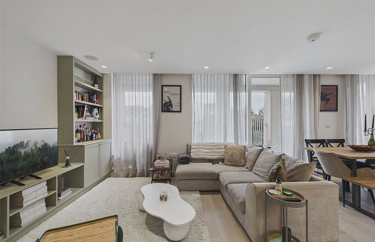 Spanning over 800 sqft, the property is entered via a welcoming hallway with built-in storage, which leads through to a spacious open-plan reception room and kitchen. Flooded with natural light from several floor-to-ceiling windows, this impressive living space offers ample room for both seating and dining and opens directly onto the private balcony. The contemporary kitchen is fitted with sleek cabinetry and integrated appliances.