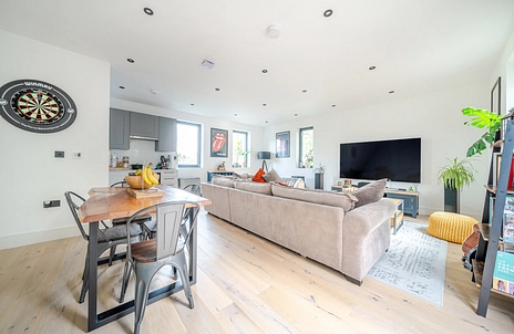 The top floor forms the heart of the home, with a generous open-plan kitchen, dining and living area that opens through bi-fold doors to a private terrace — an ideal spot for morning coffee or evening entertaining. Its layout feels more like a modern townhouse than a flat, creating a genuine sense of home and privacy rarely found in this price range.